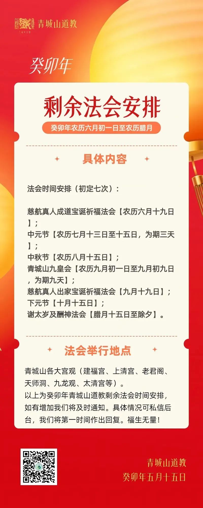 青城山各大宫观(建福宫、上清宫、老君阁、天师洞、九龙观、太清宫等)。以下为癸卯年青城山道教剩余法会时间安排,福生无量!