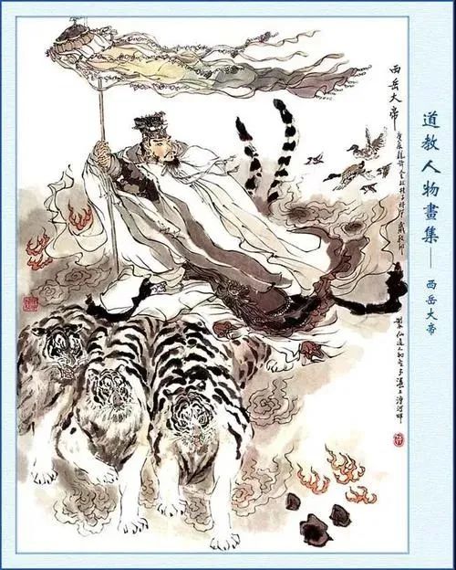 西岳大帝乃五岳之一,《恒岳志》记载:“西岳华山,终华、太白二山为副。岳神姓羌,讳”。东方朔《神异经》记载:“神姓善,讳。”《龙鱼河图》亦记载:“西方华山君神,姓诰名郁狩”诰即是昊。西岳大帝的形象是“称华山神眼白袍,戴太初九流之冠,佩开天通真之印,乘白龙,领仙官王女四千一百人。”